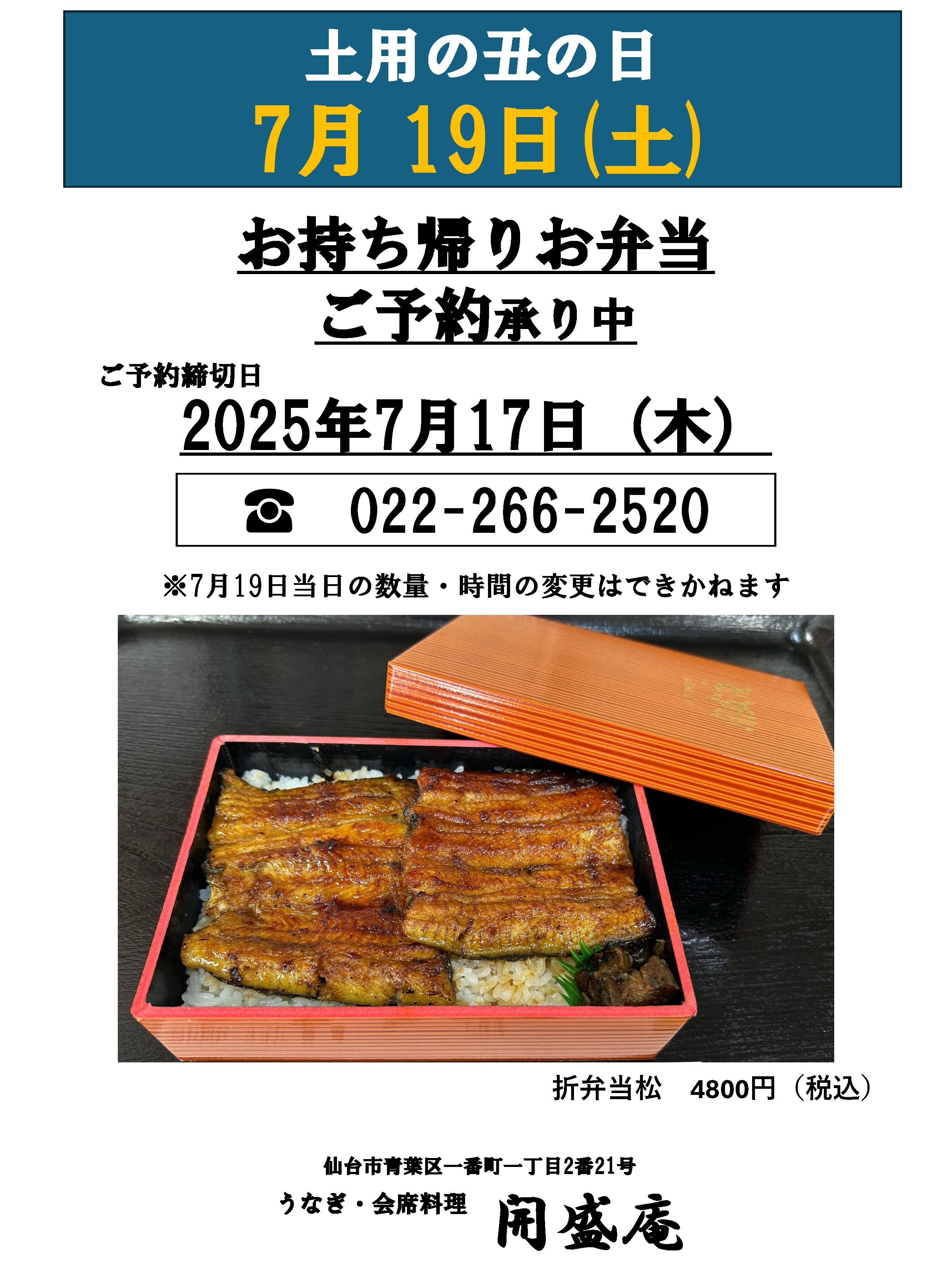 2025年7月19日 土用の丑の日 お弁当持ち帰りご予約承り中